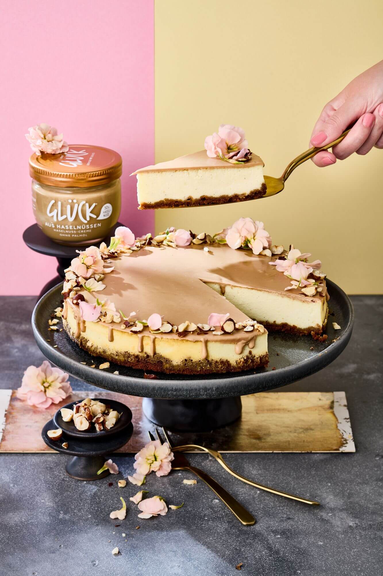 3. GLÜCK aus Haselnüssen über dem heißen Wasserbad cremig rühren und auf der Frischkäseoberfläche verteilen. Den Kuchen mindestens 1 Stunde kühl stellen. Vor dem Servieren den Backformrand lösen, die Torte mit Haselnüssen und essbaren Blüten bestreuen und anrichten.
