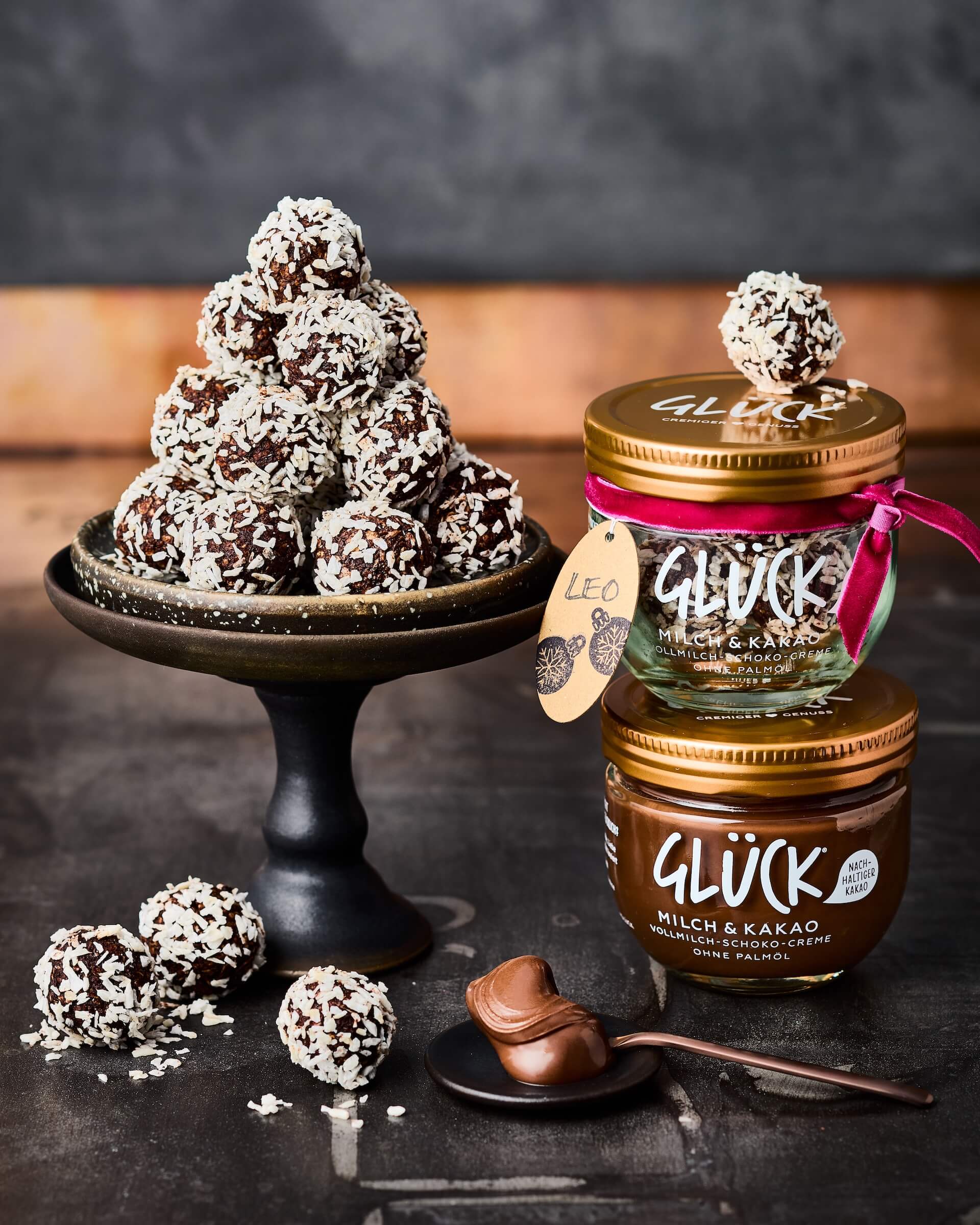 - Weiche Butter mit GLÜCK Milch & Kakao, Zucker, Kakaopulver, Kaffee und 1 Prise Salz glattrühren, bis eine homogen gebundene Masse entsteht. Haferflocken zugeben und sorgfältig mischen. Masse ca. 30 Minuten kaltstellen, bis sie formstabil ist.