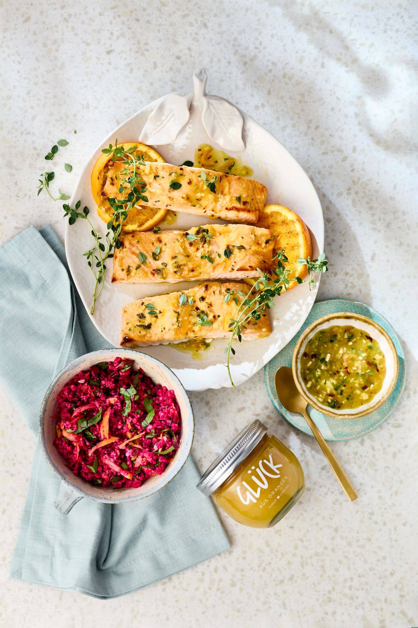 - Die übrige halbe Orange in Scheiben schneiden und in einer Grillpfanne ohne Fett kurz angrillen. Den gegrillten Lachs auf den Orangenscheiben mit dem Couscous-Rote-Bete-Salat anrichten und sofort servieren.