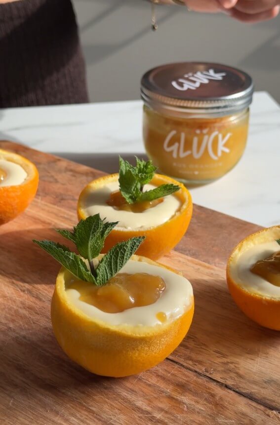 - Die Possets über Nacht im Kühlschrank fest werden lassen und vor dem Servieren mit GLÜCK aus Orangen toppen.